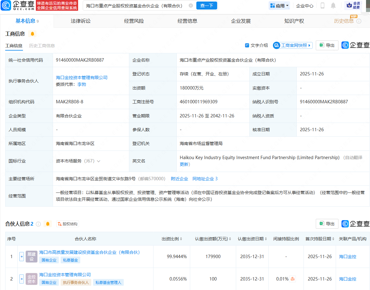 近日,海口市重点产业股权投资基金合伙企业(有限合伙)成立,出资额18亿元,经营范围包含:以私募基金从事股权投资、投资管理、资产管理等活动。企查查股权穿透显示南宁配资公司,该合伙企业由由海口市高质量发展建设投资基金合伙企业(有限合伙)、海口金控资本管理有限公司共同出资。