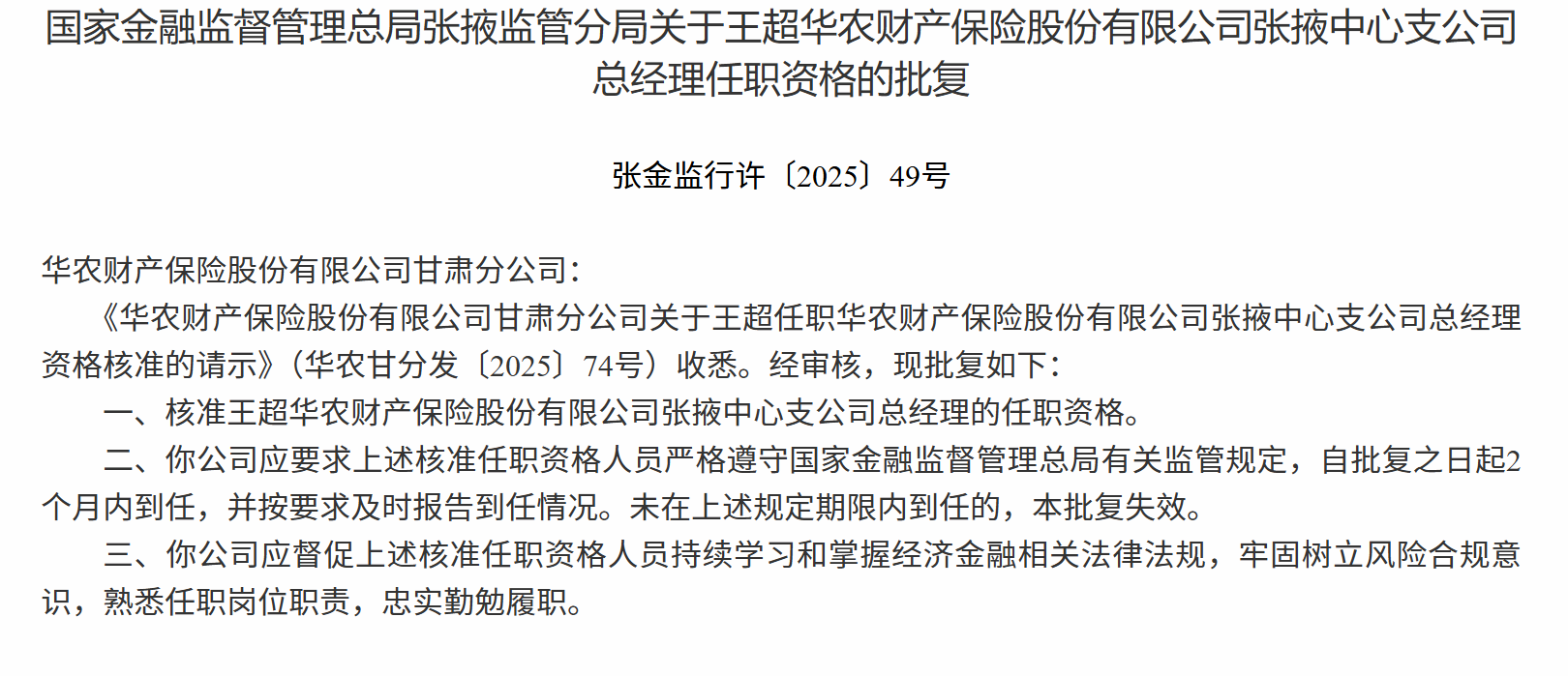 12月3日配资平台和配资炒股配资,国家金融监督管理总局张掖监管分局发布关于王超华农财产保险股份有限公司张掖中心支公司总经理任职资格的批复,核准王超华农财产保险股份有限公司张掖中心支公司总经理的任职资格。