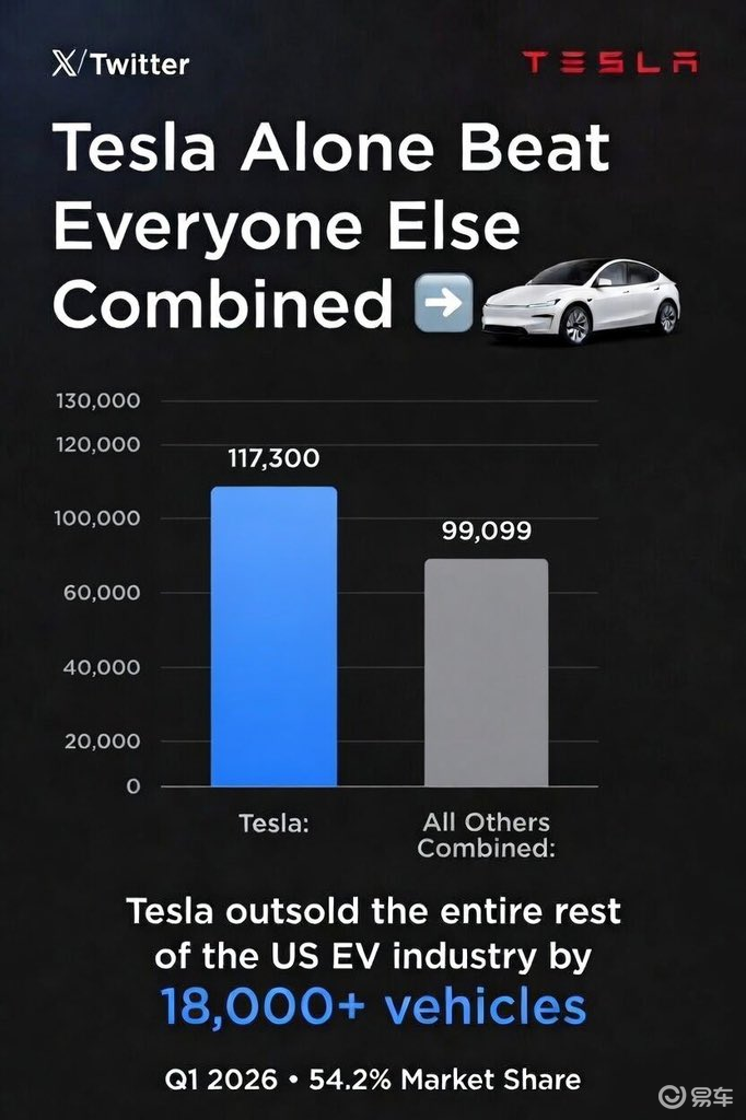 据外媒报道,2026年第一季度,特斯拉美国交付量超11.7万辆,纯电市场占有率高达54.2%。特斯拉单一品牌的销量,比其他品牌纯电车型的销量总和还要多出1.8万余辆。