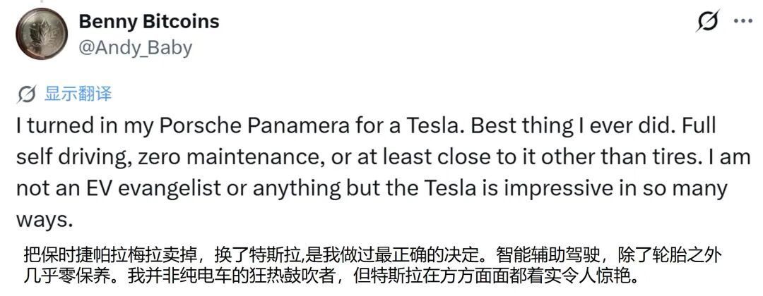 “把保时捷换成特斯拉是我做过的最好决定,它几乎零保养。”