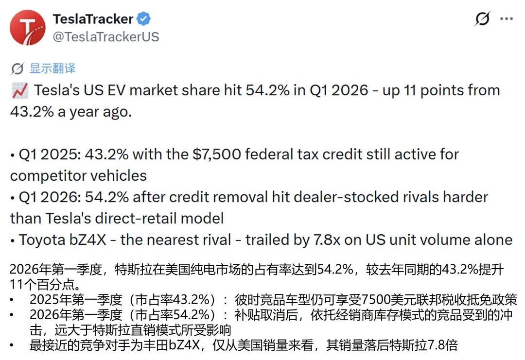 博主@TeslaTrackerUS 分析认为,美国补贴政策退坡,直接触发汽车销量震荡,对比之下,特斯拉强大的产品实力不依赖补贴波动和价格变化,即便脱离政策扶持也能保持稳定的市场认可度,成为其市占率逆势攀升的核心原因。