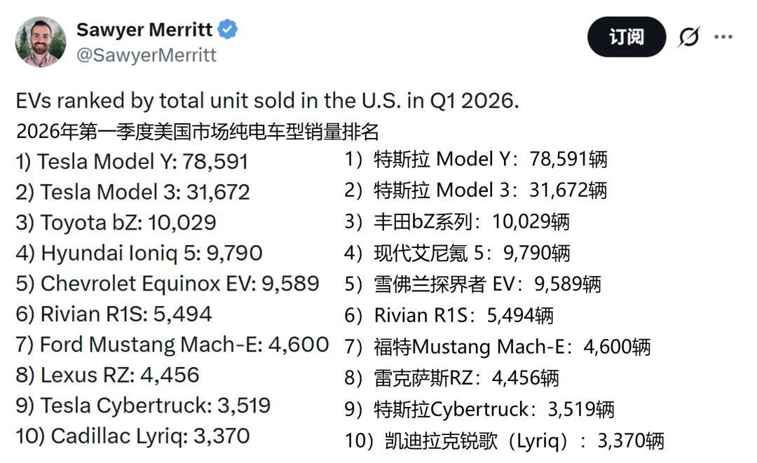 具体到车型表现,博主@SawyerMerritt 分享最新统计销量榜单:Model Y凭超7.8万辆的销量成绩,成为美国第一季度最畅销的纯电动车;Model 3紧随其后,两款车型包揽当地电动车销量冠亚军。